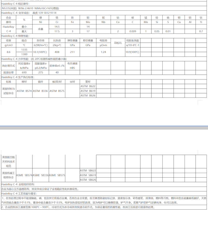 HastelloyC-4哈氏合金C4技术标准,成分元素,性能指标
