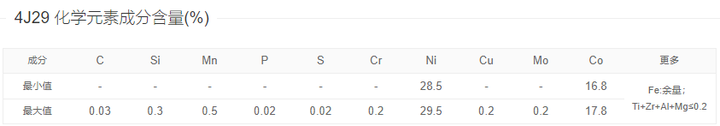 4J29的化学成分包括铁(Fe)、镍(Ni)、钴(Co)以及少量的硅(Si)、锰(Mn)、磷(P)、硫(S)、铜(Cu)、铬(Cr)、钼(Mo)等元素。具体成分如下: